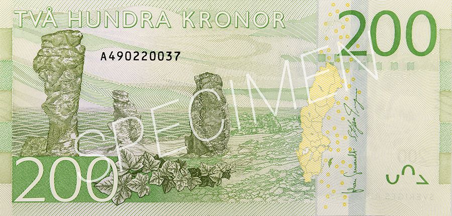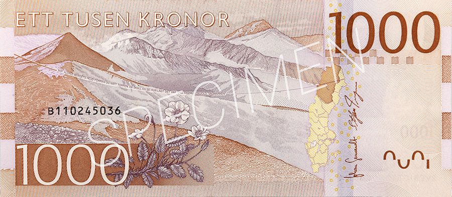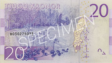 På sedelns baksida syns ett småländskt landskap med en stenig äng, skog och gärdesgård. Framför står Smålands landskapsblomma - Linnéan.