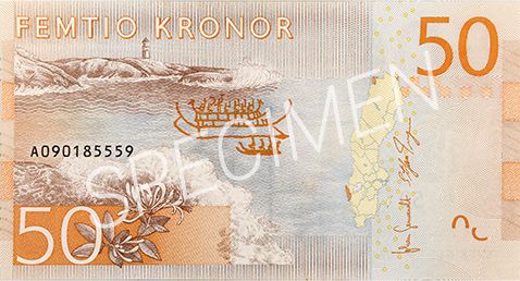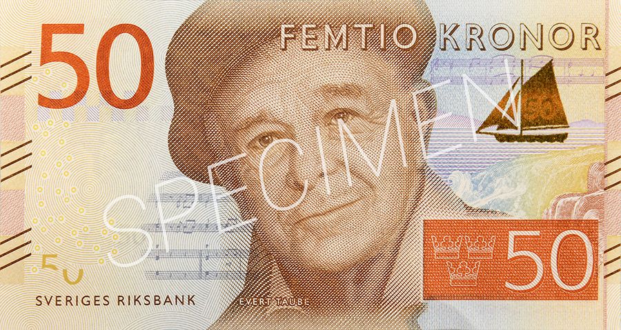Sångaren och skalden Evert Taube pryder 50-lappens framsida. Han har ett skepp bredvid sig som ändrar färg med ljuset och om du undrar över noterna intill honom är de inte bara dekoration. Spelar du dem ljuder Sjösala vals.