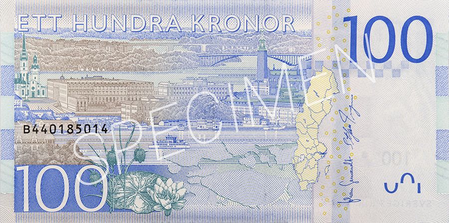 Den mytiska, mystiska Greta Garbo fick hedersplats på hundralappen. Hon utnämndes till femte bästa skådespelerska genom tiderna av Amerikanska filminstitutet. Greta hette Gustafsson från början och var född i Katarina församling i Stockholm. Runt henne på sedelns framsida ligger naturligtvis filmremsor och en extra remsa blir säkerhetsdetalj.