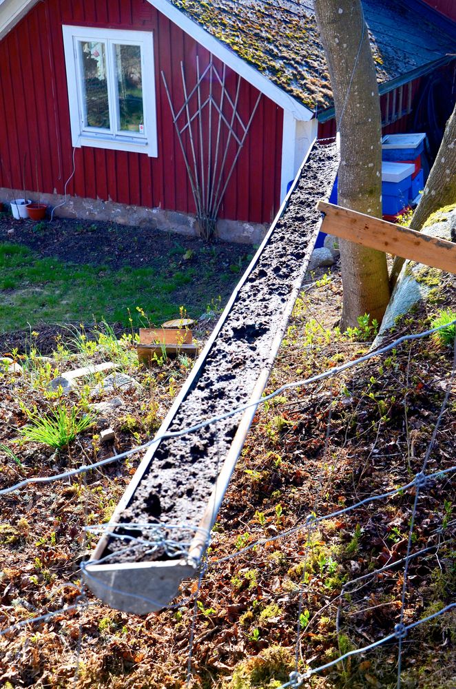 Han borrade hål i ändarna och trädde in ståltråd. Den virade han runt stammarna kring två träd som han hängde rännan emellan. Rännan hänger på cirka en meters höjd, så att det är enkelt att vattna.
