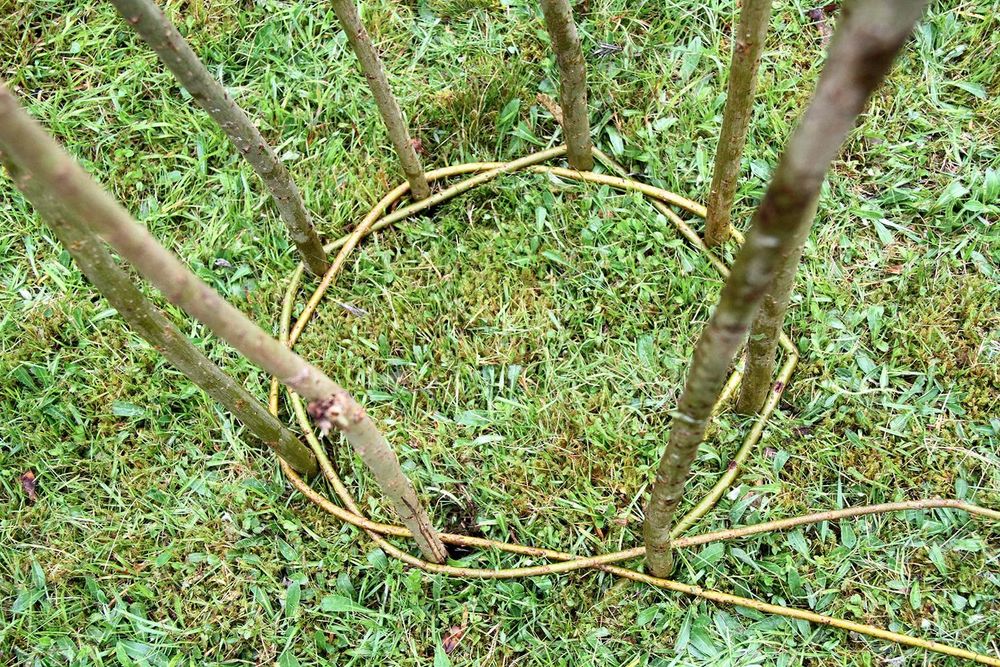 1. Gör hål i gräsmattan med ett maskrosjärn och stick ner stöttorna i marken på ett djup av 15–20 cm. Avståndet mellan stöttorna bör vara ca 10–15 cm. Denna cirkel bildar stommen.
