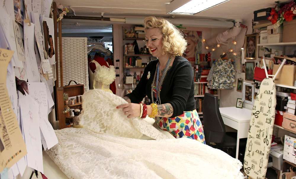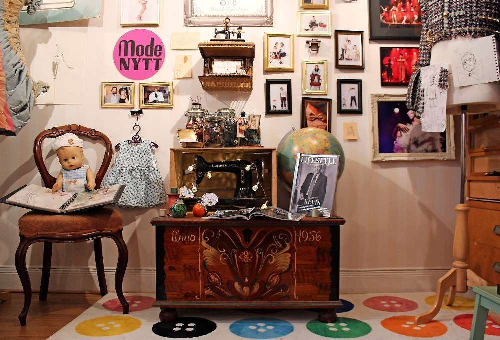 I det färgglada rummet hänger vintageklänningar tillsammans med fotografier på kända kunder som Edward Bloom och The Hives. Hit kommer folk för att få specialdesignade kläder eller för att få en gammal pärla att glänsa igen. Magin sker i rummet längst in i ateljén. Där står symaskinen uppställd och på ”operationsbordet” ligger en vit spetsklänning. Ovanför kläs hyllorna av hattaskar och lådor.