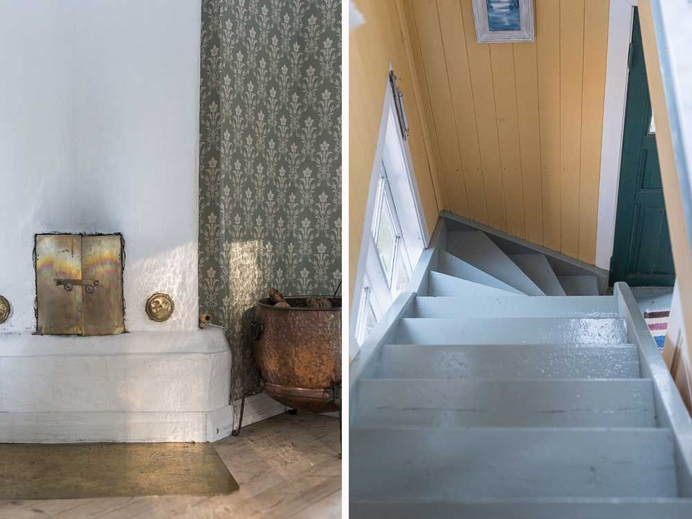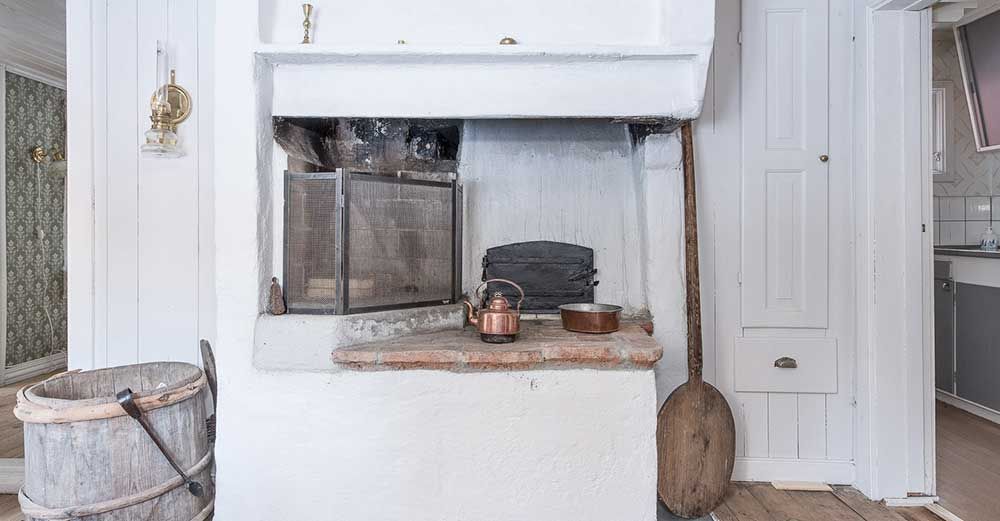 Köket med spiskupa ger underbar karaktär till köket, likaså kammarens eldstad, tapeter och husets alla trägolv.
