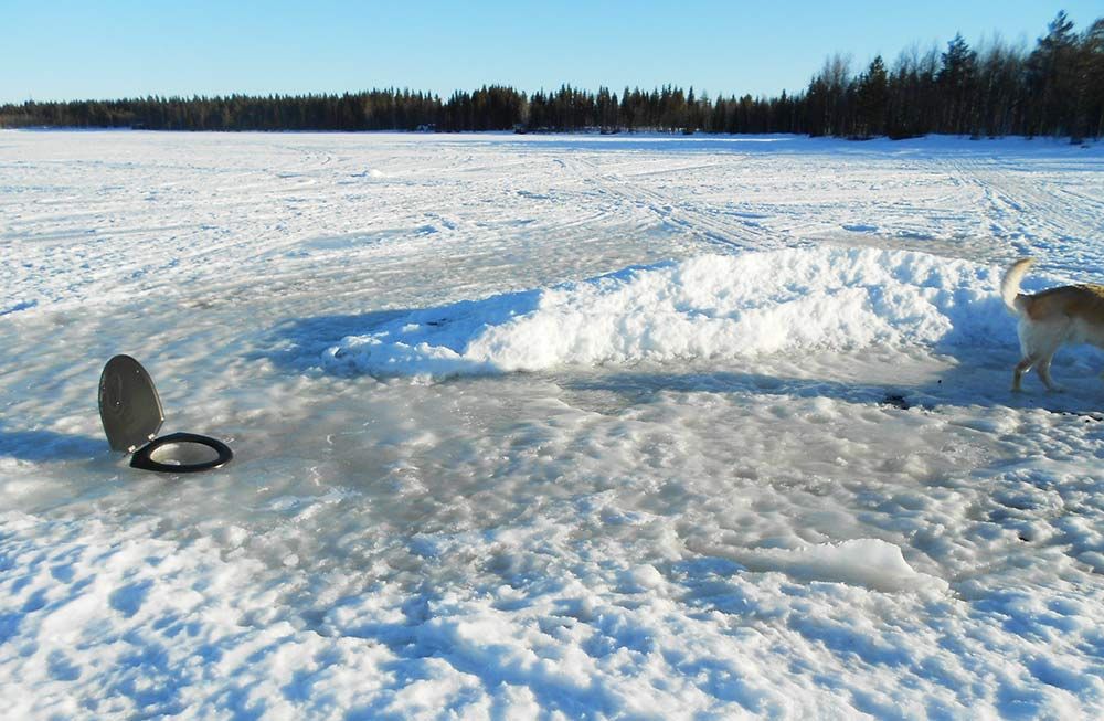 – Jo, skämt åsido, toaletten är gjord att fiska ur så att pimpelhålet inte fryser igen. Det tar mindre än en minut för mig att ta mig hem till den riktiga toaletten!