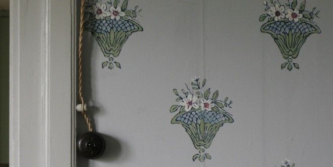 Tapeterna är handtryckta som på 1800-talet. Ledningarna är textilklädda, om än nya, medan ljusknapparna är återvunna.