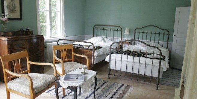 De gamla järnsängarna pryder sin plats i sovrummet. Om än med bekväma madrasser.