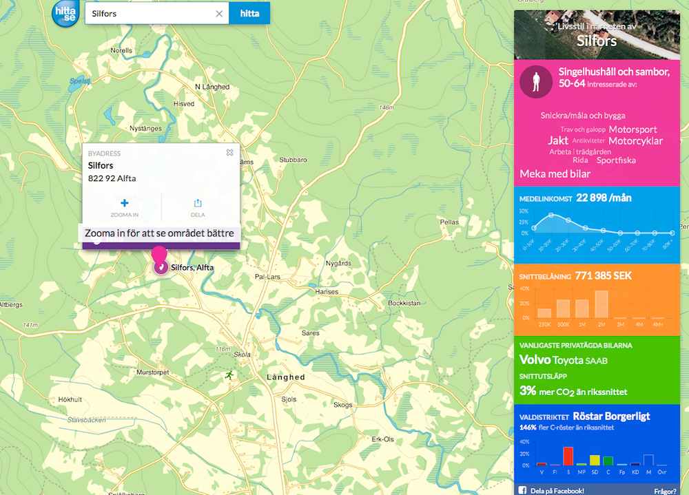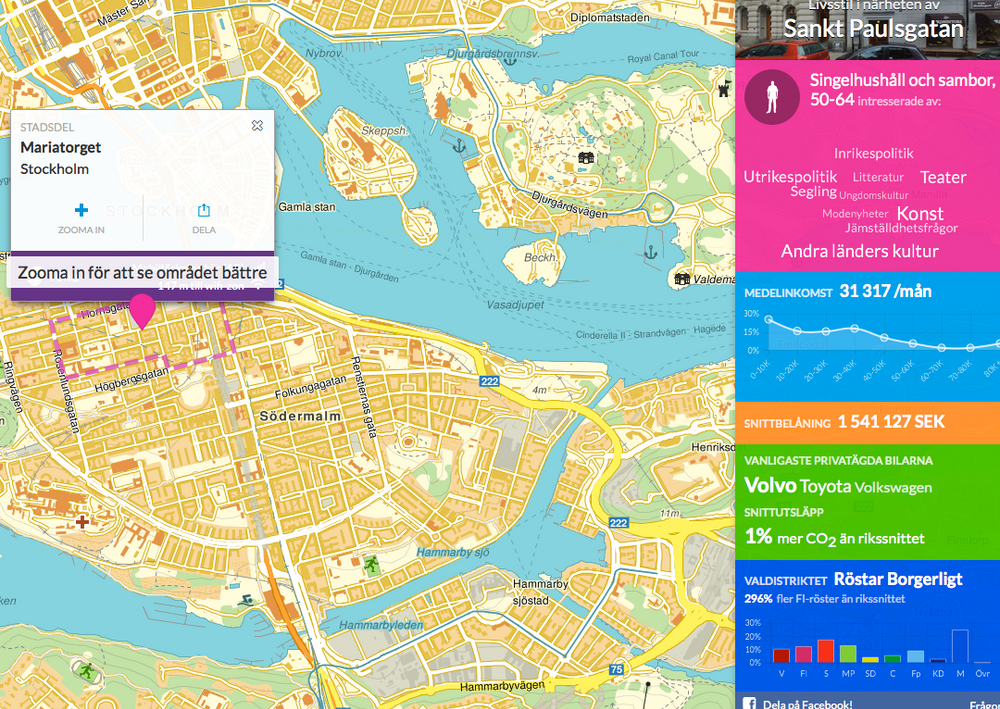 Här syns allt från intressen, medelålder, skuldsättning och inkomst i genomsnitt till vilket bilmärke man kör.