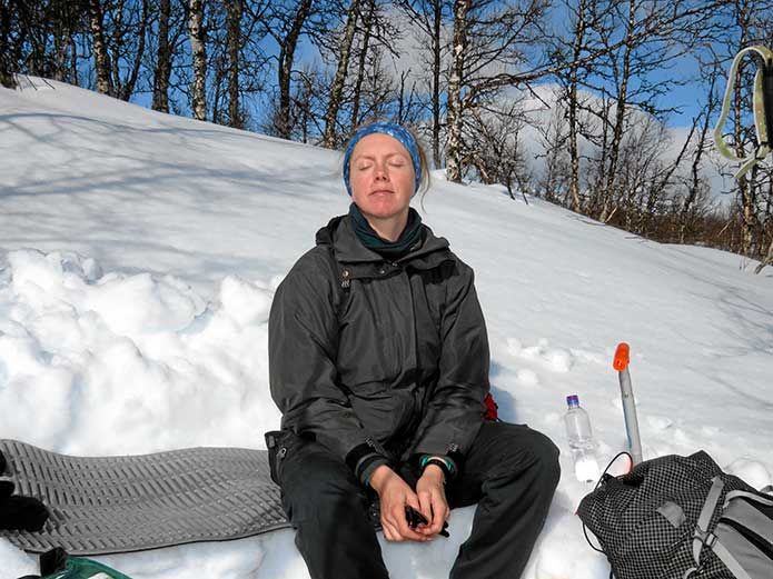 Nästa morgon är stilla och vårvintersolen strålar över Vindelfjällen. I alla fall på 760 meters höjd där vi startar etappen mot Servestugan.