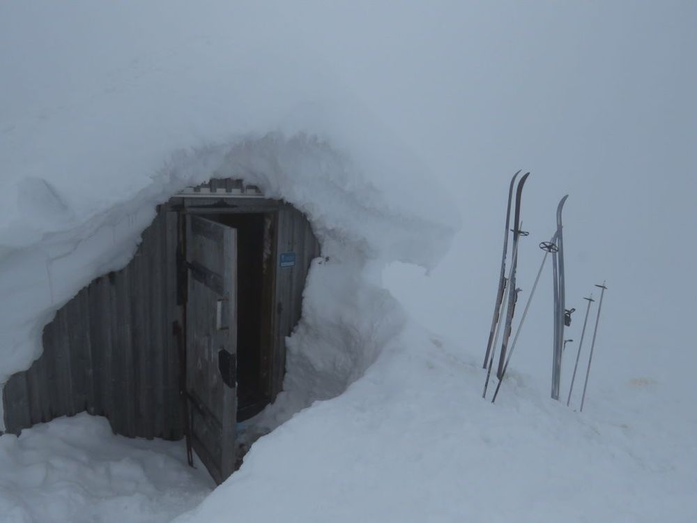 Efter några dimmiga kilometer dyker en pytteliten raststuga upp, nästan helt begravd i snön. Detta vindskydd högt uppe på Juovvatjåhkkafjället var nyligen med i dramatiska rapporter i riksmedia.