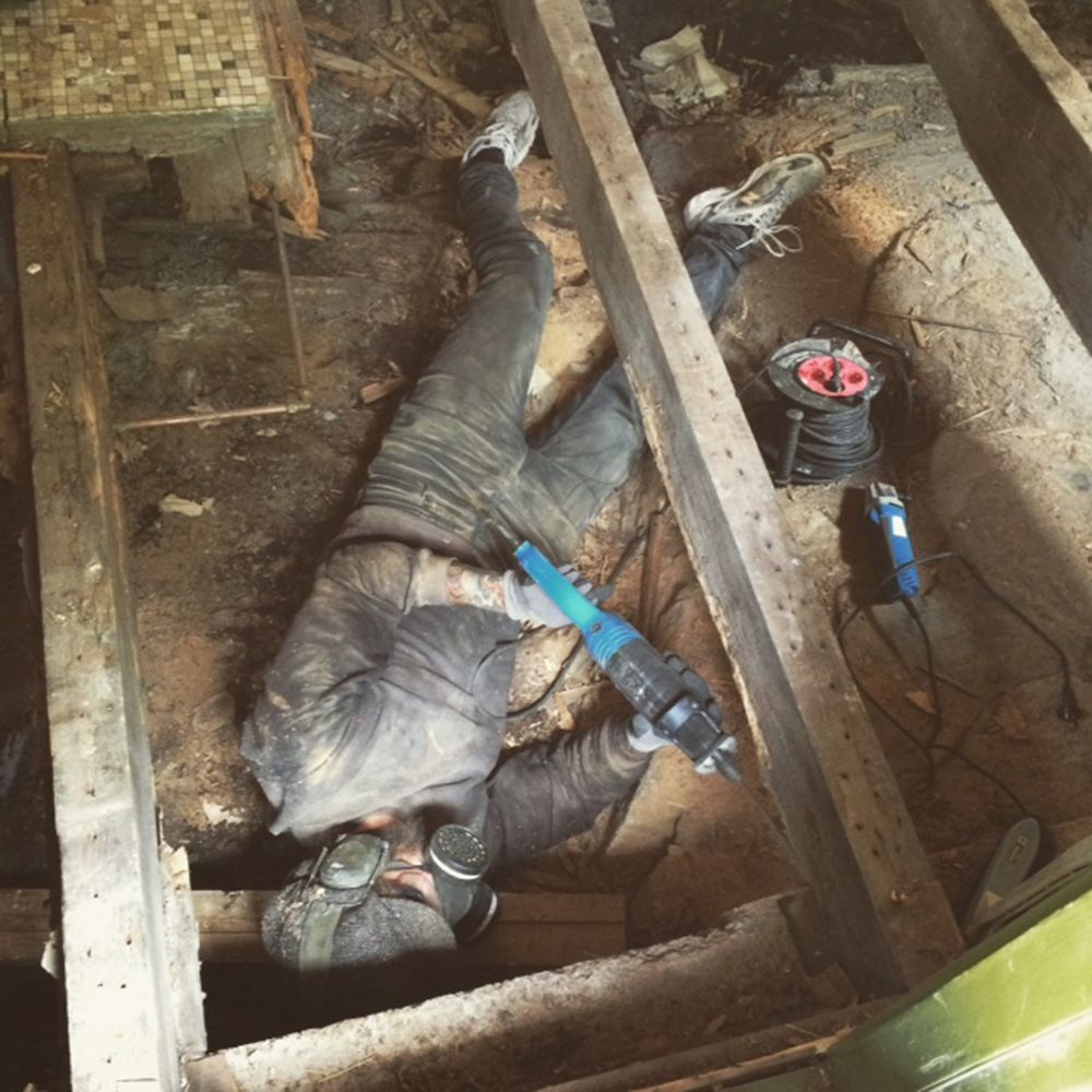 Längre från Ernst Kirchsteigers program är det svårt att komma. Linnea Skoog skickade in bilden på maken som renoverar golv i stugan i Ånimskog.