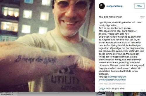 Sundsvallsartisten Mange Hellberg tog sig upp ur missbruk och hemlöshet och gör succé med sin musik. Hans låttitel "Simma eller sjunk" har tatuerats in på huden av 300 personer – däribland Mikael Persbrandt.