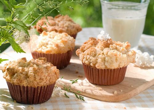 Muffins med rabarberkompott och en svag smak av bittermandel är godast allra nygräddade.