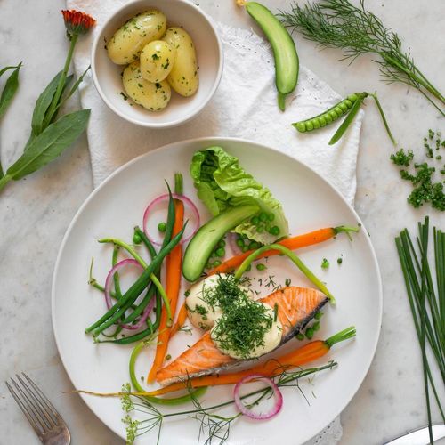 Dill, primörer, färskpotatis och majonnäs. Bjud på en somrig tallrik med stekt inlagd lax i huvudrollen.