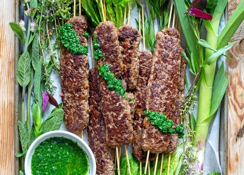 Grilla saftiga färsspett med underbar smak av nygrillat och grön örtsalsa. Katarina Ekeströms recept är ljuvligt.