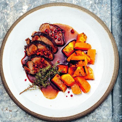 Mustiga höstsmaker i smakfulla höstfärger. Hjortstek med rostad pumpa och rosépeppar kan bli höstens paradrätt.