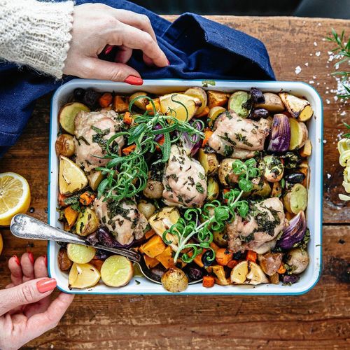 Du gör en kylskåpsrensning och kör in allt i ugnen. Ut kommer en tiopoängsmiddag som räddat trötta råvaror. Prova Linnéa Seidel i ett-kyckling.