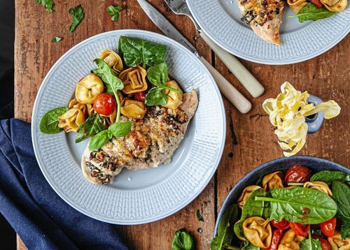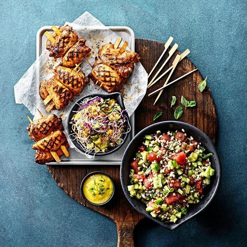 Gör en härlig glasnudelsallad med kål, avokado med mangodressing samt melon och gurksallad med matvete. Serveras här med färdigmarinerad lårfilé med smaken Black Garlic.