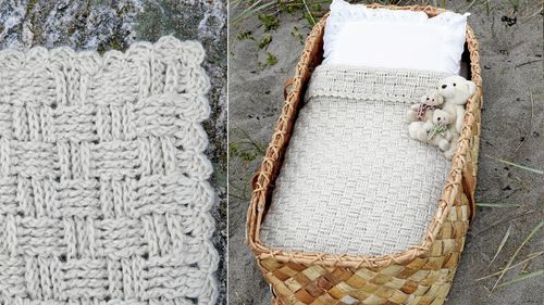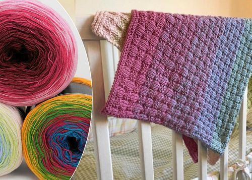 Våffligt korgmönster med extra struktur. Sticka en klappvänlig sommarfilt till barnsängen med garn som randar sig självt.