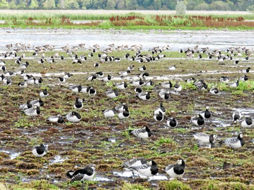 Flera tusen gäss rastar i Hjälstaviken på höstarna. Här syns framför allt vitkindade gäss och bortom dem grågäss.