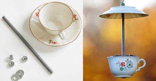 Pyssla om småfåglarna och gör samtidigt fint i trädgården. Med hjälp av en kaffekopp med fat, en metallstomme och några muttrar får du ett gulligt matbord att hänga upp i trädet.