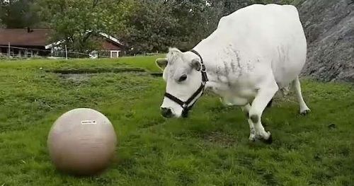 Inte alla gör som fjällkossan Lotta på Backa Västergård – hon har sparkat runt sin pilatesboll i tre år och har utvecklat fin bollkontroll.