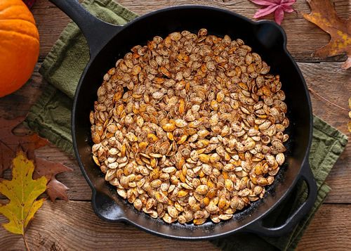 Rosta pumpakärnorna gyllene i stekpanna eller på plåt och servera som tilltugg.