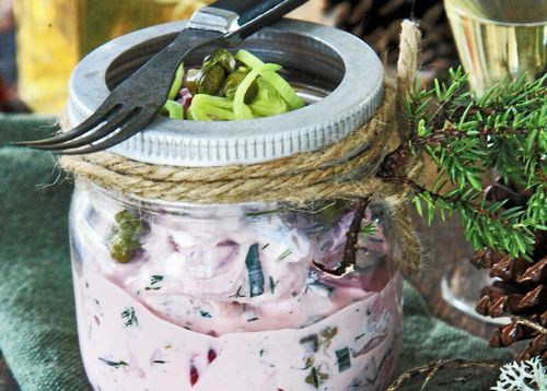 En gravad ansjovisströmming med kapris, purjolök och dill att duka fram till julens buffébord.