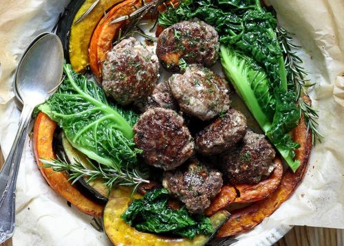 Lammfärsbiffar med ugnsrostad pumpa och savoykål serveras med äppeltzatziki.