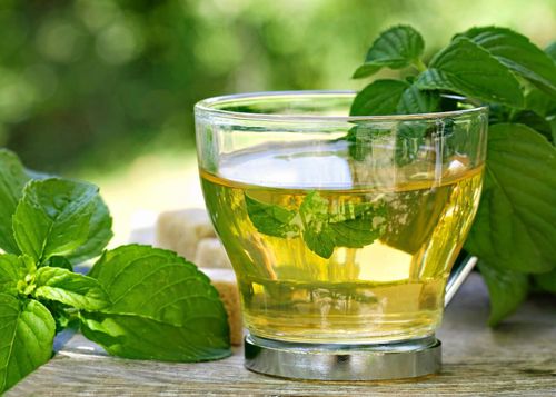 Hemgjord teblandning med grönt te, färsk mynta och lite socker.