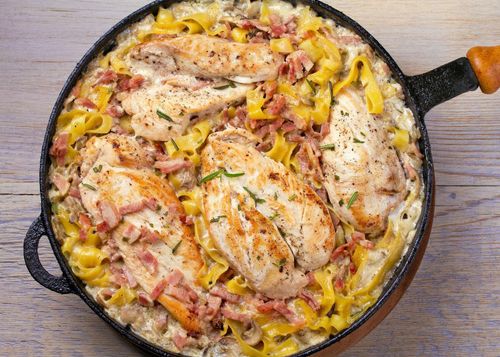 Pastapanna med kycklingbröstfilé, bacon och gräddig svampsås.