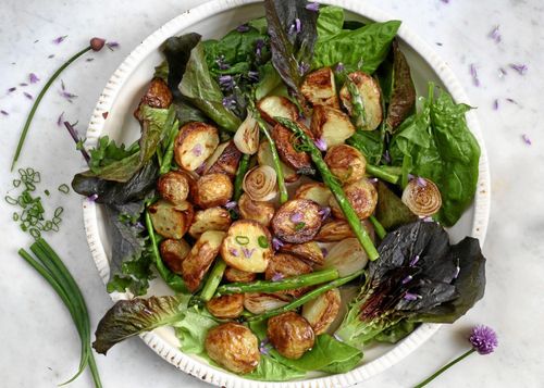 Rostad potatis och sparris serverat med salsa verde, grön salsa, på örter, sardeller och kapris.