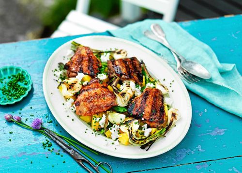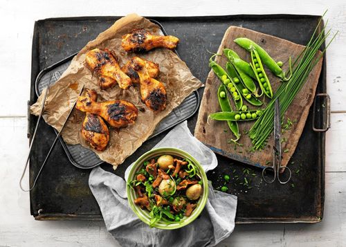 Grillade kycklinglår med en sallad på gulbetor och sockerärtor lämnar ingen besviken.