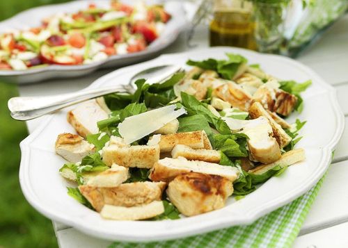 En matig sallad smakar himmelskt gott till marinerade grillade kycklingben.