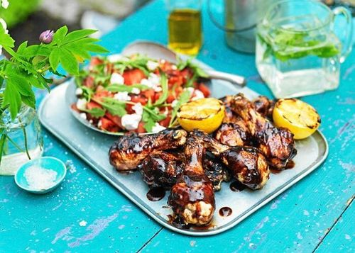 Kycklingklubbor och somrig sallad på vattenmelon och festost.
