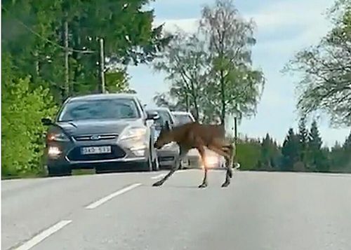 Djurvårdarstudenterna såg en älg och hennes kalv komma springande vid landsvägen och började filma.