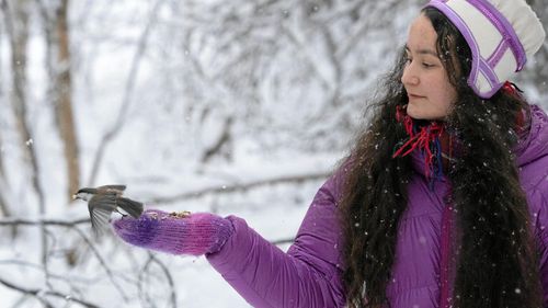 Elever vid Lapplands gymnasium i Jokkmokk studerar naturen genom sin fågelmatning. Småfåglarna landar tryggt på deras vantar och tar för sig. Hushållsost är en favorit.