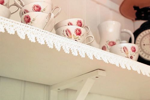Virkade kantband till hyllorna ger köket en lantlig och romantisk stil. Här är virkbeskrivningen till hur du gör!