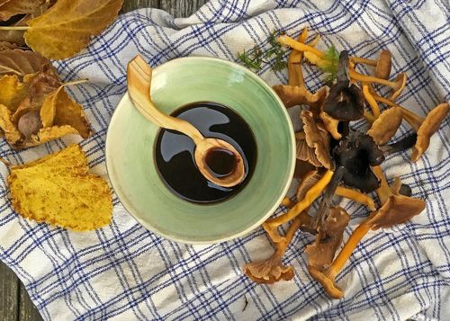 Den ser ut som sojasås och används på samma sätt men har inget med bönorna att göra. Du kokar den själv av svamp från skogen.