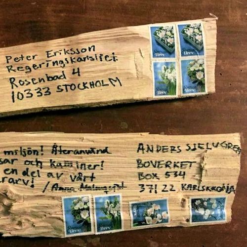 Vedspisupproret eldar på med humor. Nu postar medlemmar vedträn till både bostadsministern och Boverkets generaldirektör. På varje vedträ plitas en uppmaning att skrota de nya vedspisreglerna.