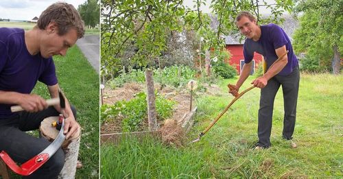 Det handlar om skärpa, schvung och ett stadigt tryck mot marken. Jan Wester, Slåttergubben, och hans son Einar visar hur det går till.
