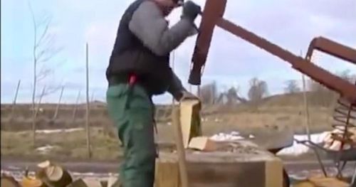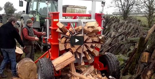 Knak, brak! Se monsterklyven göra kaffeved av tjockstocken! Vad får man om man korsar en traktor med en kak-sprits? Det här! En morrande jättemaskin som spritsar ved.