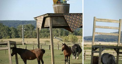 En bonde i Döllstädt i Tyskland fick inte bygga ett tak för att skydda sina hästar, hans lösning är fantastisk. Han byggde helt enkelt ett giganskt bord med två stolar. Det behövs det inget bygglov för – smart va!