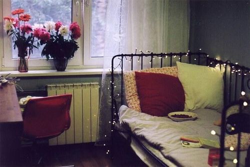 En soffa eller säng med stålram går utmärkt att dekorera med ljusslingor. Mysfaktorn blir definitivt hög.