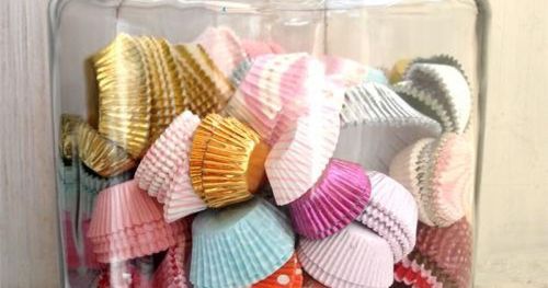 Färgglada och fina muffinsformar förtjänar en plats bortom kökslådan. I en vacker gammal glasburk skapar de en snygg dekoration i köket.