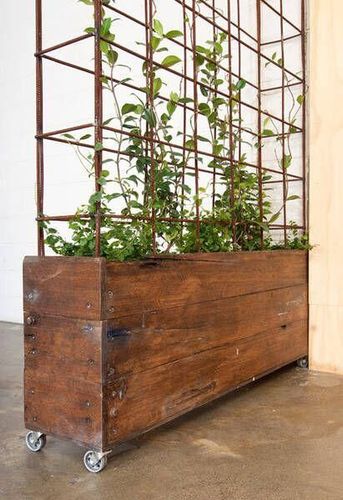Snygg rumsavdelare gör du av en odlingslåda på hjul och armeringsjärn. Låt blommorna växa på höjden och njut av en grönskande vägg.