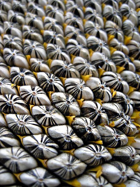 Det här är solrosfrön, inte en flock zebror sedd från ovan.