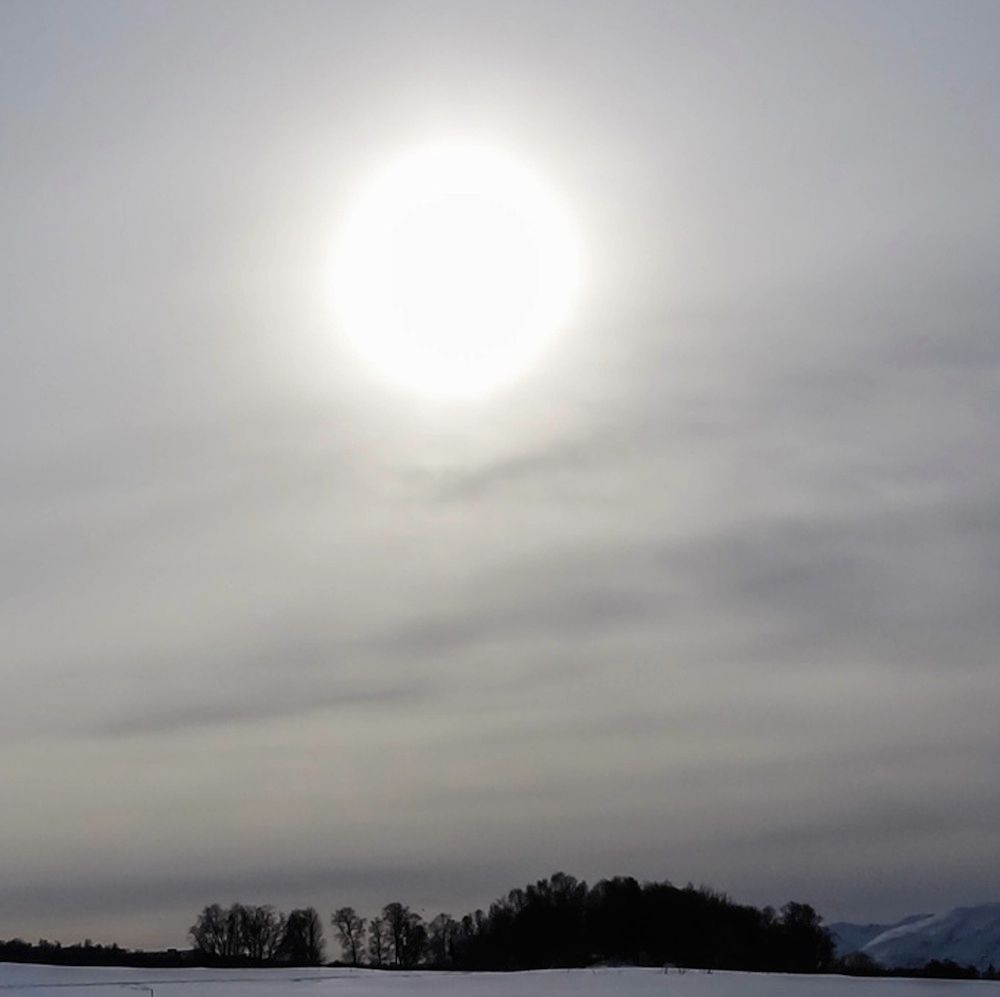 Slöjmolnen tätnar till lägre liggande skiktmoln och solen syns knappt igenom. Nu är fronten nära och regnet kommer om en eller ett par timmar.