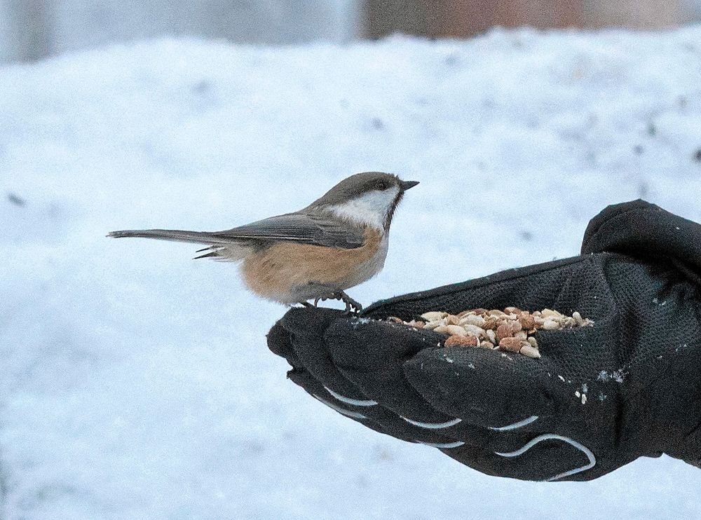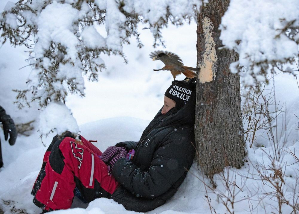 Elever vid Lapplands gymnasium i Jokkmokk studerar naturen genom sin fågelmatning. Småfåglarna landar tryggt på deras vantar och tar för sig. Hushållsost är en favorit.