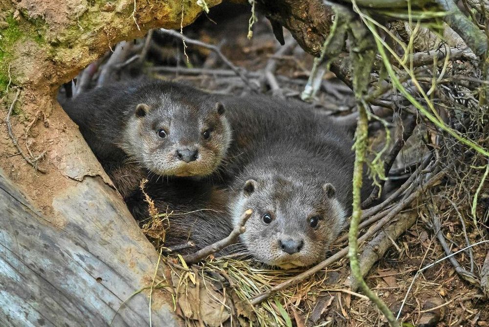 Vid födseln väger de cirka ett hekto, är blinda och har en gråaktig ullpäls. Först efter ett par månader kommer de ut, och börjar sedan simma efter ytterligare någon månad. Därefter följer de honan nära och lär sig fånga fisk av henne.