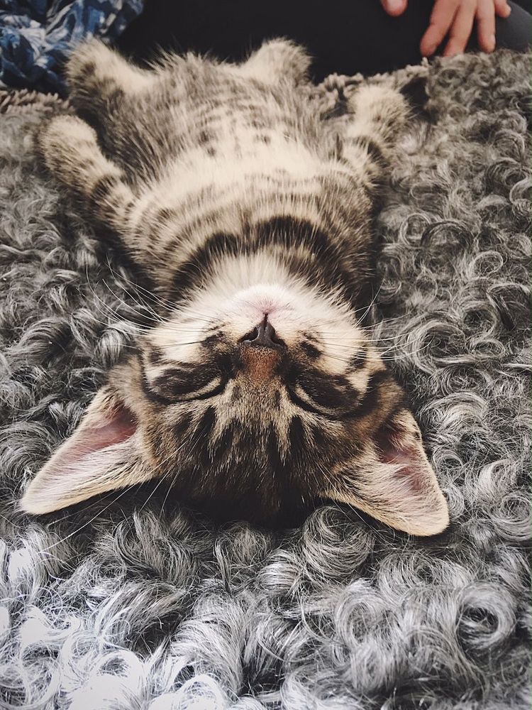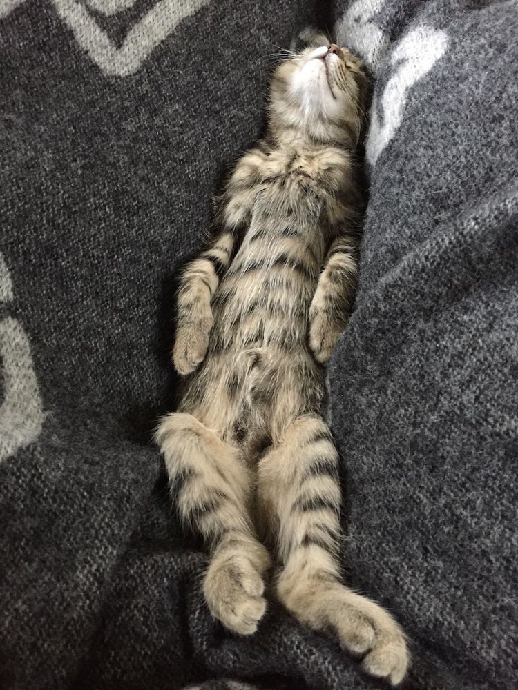 På bilden är han 10 veckor gammal och totalt avslappnad. Eftersom han är en mixad katt med lite perser och manxkatt i har han en speciell stil.